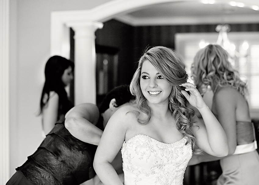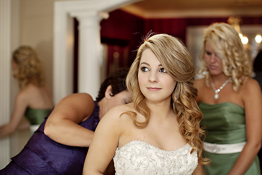 I love this photo. Brittany is surrounded by doting bridesmaids and her mother making sure everything is perfect with the dress.