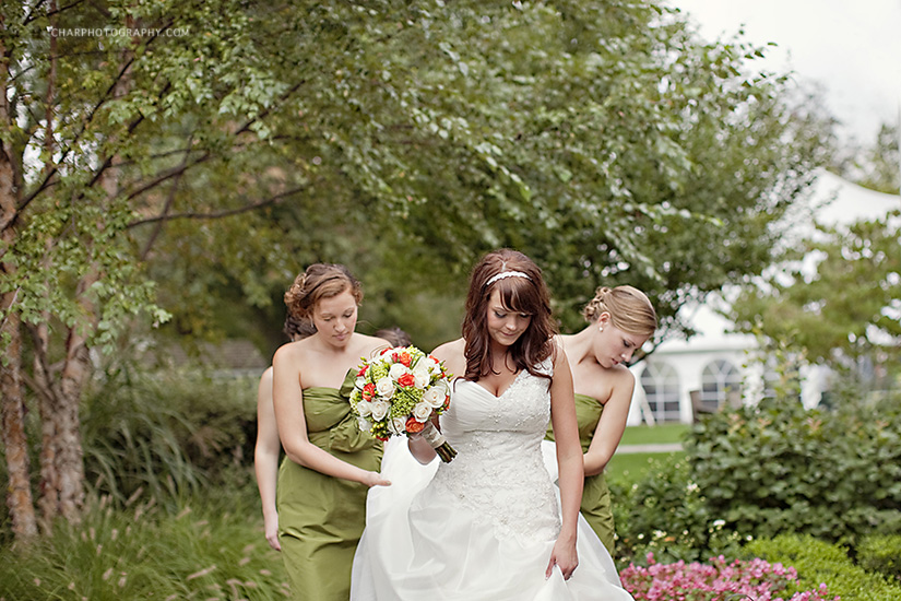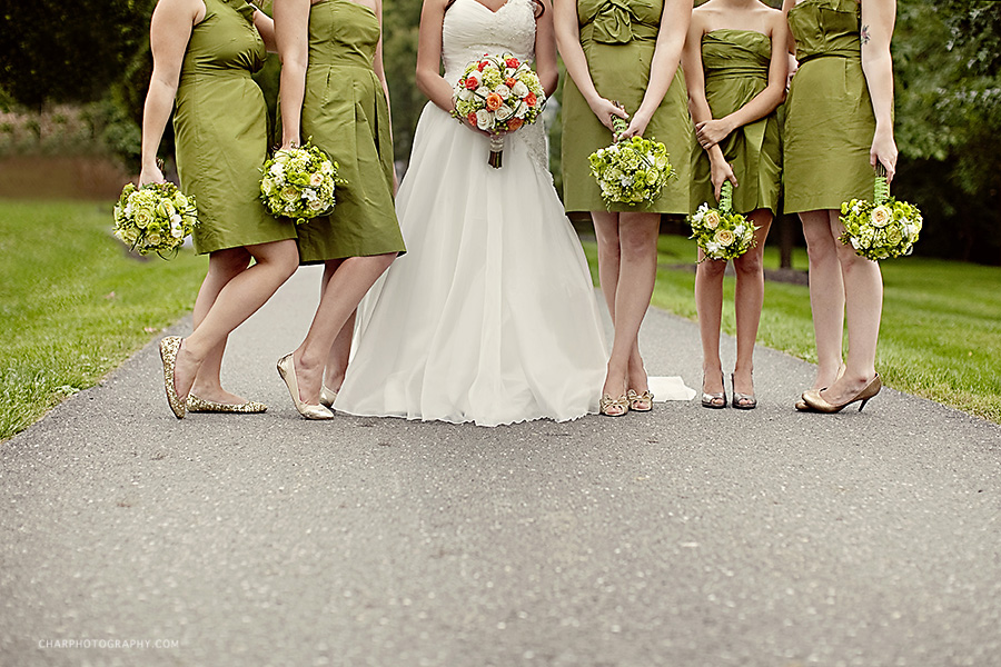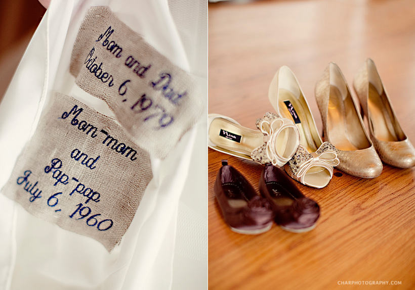 Brittany sewed the wedding dates of her parents and grandparents on the inside her dress. The bridesmaids wore such a pretty collection of gold and bronze shoes.