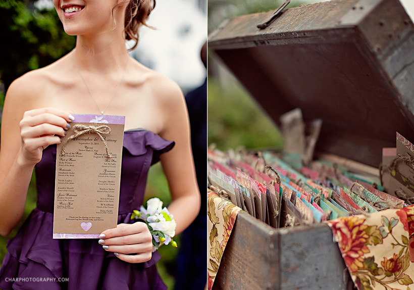 Brittany put lots of time and thought into details. She did a fantastic job. Handmade bulletins tied up with twine displayed in a wooden chest.