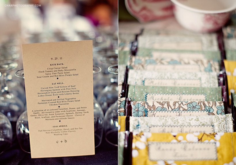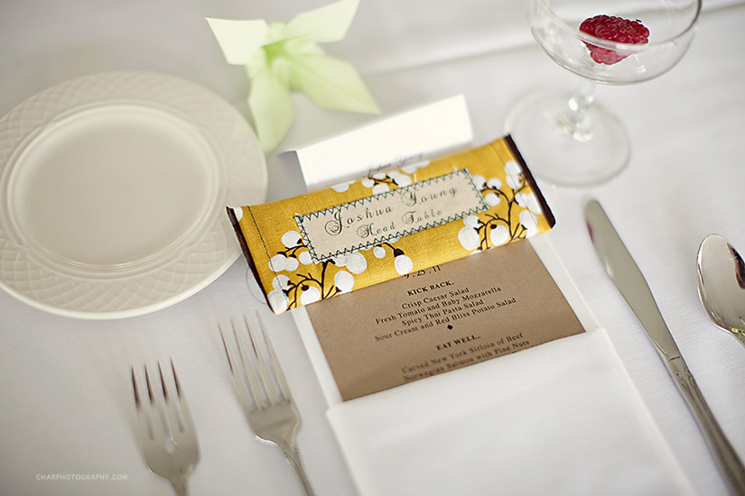 Another detail. Brittany hand stitched fabric covers for the chocolate bar place cards. Each candy-bar included the name and table number. So pretty.
