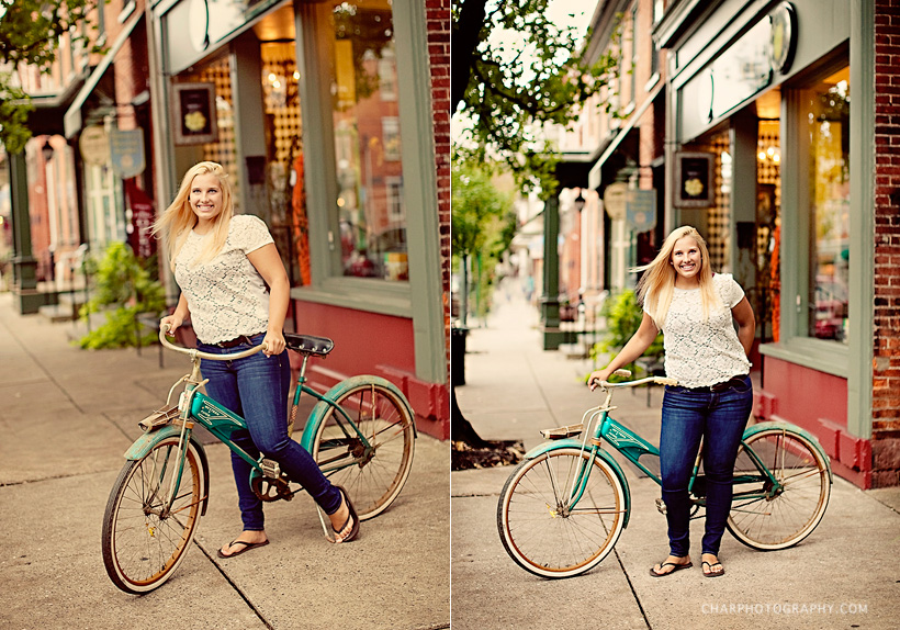 Catherine! I met Catherine for the first time a few years ago when I took photos of her with her sister and Grandma. I love her bubbly and smiley Catherine is. This day turned out COLD and windy…but Catherine took it like a champ. Catherine choose downtown Lititz as her location. So we raced around the streets and made this a fast session. Just because this bike was waiting there for us (;, we had to use it…