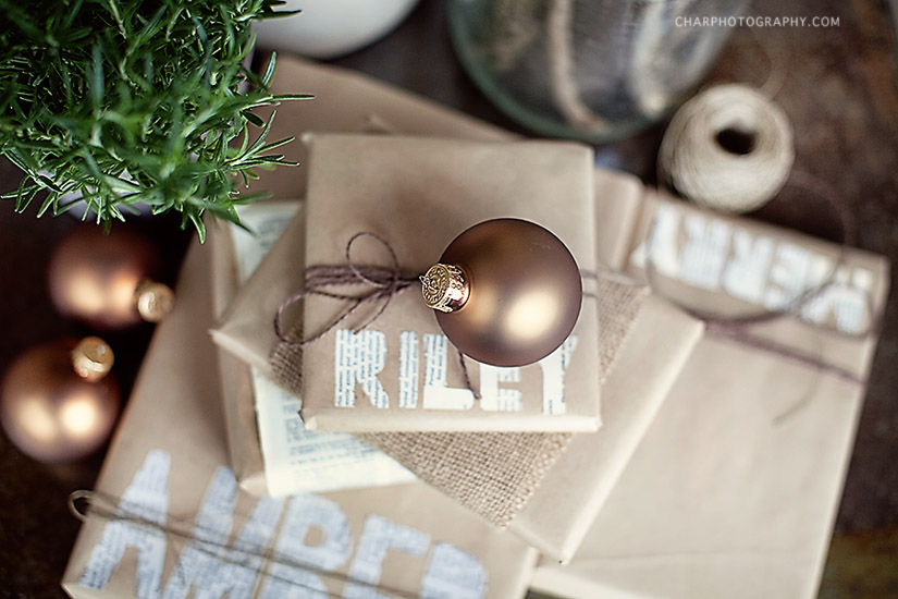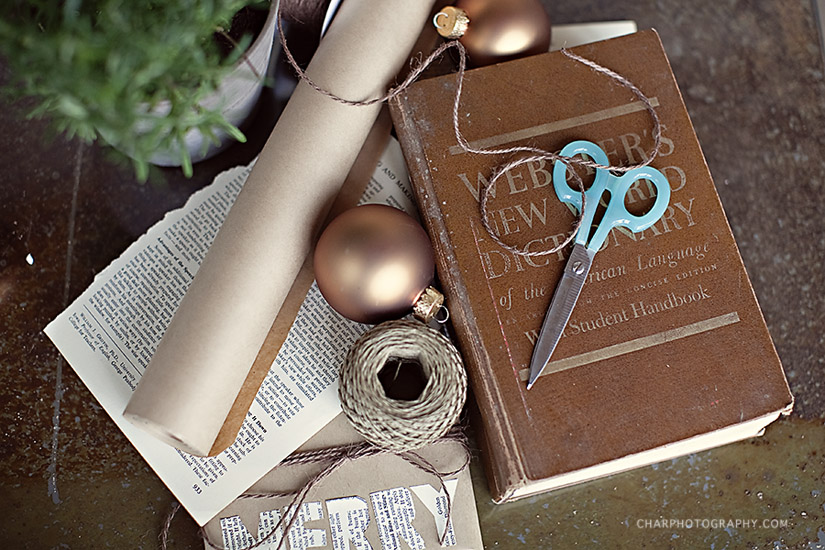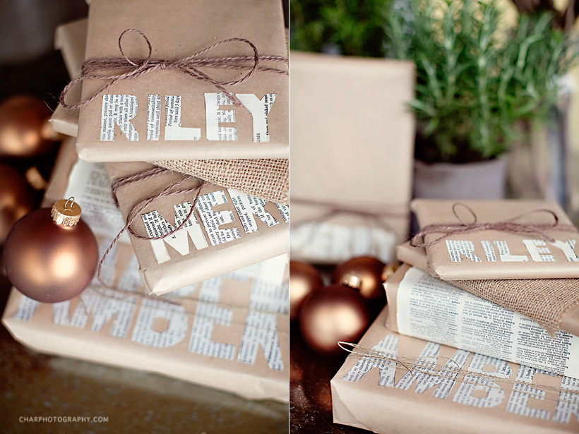 I like simplicity. Simplicity allows my brain to rest. And honestly, I do not have enough of energy for complicated. (;. Each year I like to choose a gift packaging theme. This way I do not have rolls of mismatched wrapping paper. I decide only once what paper and ribbon to use. I get the supplies I need for one ‘look’, remind myself to keep it simple and quick, and then let my brain be creative. So fun and I love it. Little projects like this is like a breath of fresh air for my brain. Since much of my creativity is done on camera and behind a computer screen, I love using my hands to cut, snip, and glue. A pretty packaged gift makes the experience of receiving and giving a gift a little extra special. However, the packaging needs to be inexpensive and simple. Promise Tangeman always inspires me. This time she inspired me to use text as an element of the packaging.