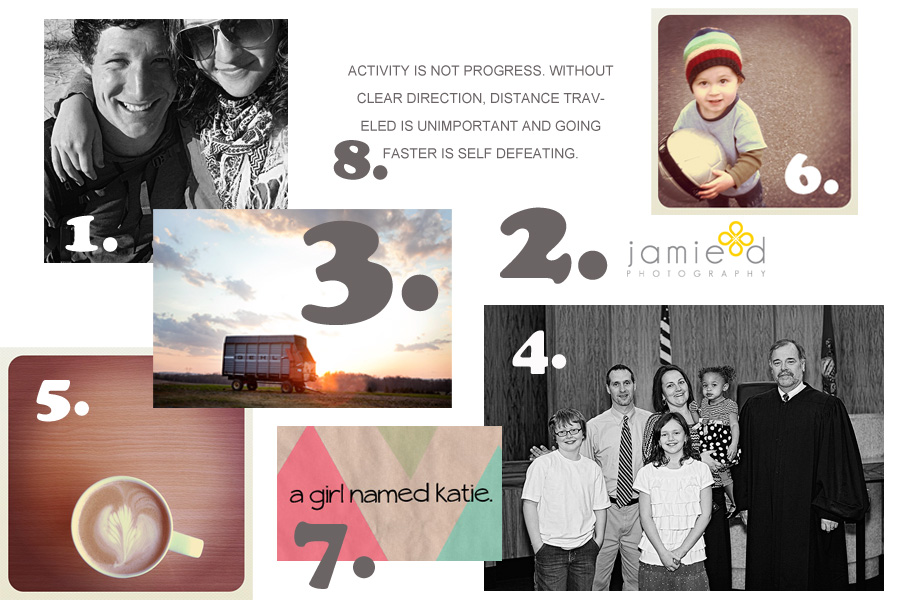 1. Well for one thing, my little sister is getting maaaaried! I am so excited for her. And yeah, I will admit…I am just a little excited to help her plan this wedding. 2. I met Jamie for the first time this week. And I am so glad I did! She inspired me and she is a sweetheart and this made me truly happy. 3. I am running! This is good. I used to be a runner. And then the business happened and I stopped doing things that didn’t demand to be done. Well, now I am learning this is no way to live life. If I don’t have time to do ‘just for fun’ things…something has got to change. I forget how much energy and creativity running gives me. I am training for a 10 miler! Am I crazy? I am up to 4 miles. Wish me luck. Best part is, I am training with Andrew. Corde runs with us…in the stroller, that is. The other night we were running and I saw this sunset and hay wagon scene. NO, I do not carry my camera with me, crazy. But I DROVE back with my camera to get this photo. It said peace to me. 4.Yesterday I was honored to witness an adoption. Truly beautiful. Colleen is a friend of mine and I am so happy for her and her new daughter, Bella. 5. Coffee like this and strategic planning AND a dear friend all at once?!! Loveliness. 6. Boys:). 7.Don’t forget…if you are in the area and want to see Katie’s goodness, stop by the studio tomorrow morning! 8. And food for thought. At least it has been my food for thought.